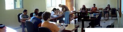 Just want to give another praise report. Towards the beginning of School of the Bible we asked some people for some donations for our classroom. Some of the other School of the Bible locations gave, and also other YWAMers. The money that came was just less than a thousand dollars. In our school we have a guy who worked with wood in his job (on the bottom of the photo with the blue shirt). So he built some really beautiful tables for our classroom and he finished about a month and a half ago. And with the rest of the money and some school money we bought some other miscellaneous stuff and really nice chairs that will last for years to come (and so much better on peoples bottom sides!) It makes so much a better classroom environment, it great! Thanks for all who gave. Praise the Lord and give all glory to Him!