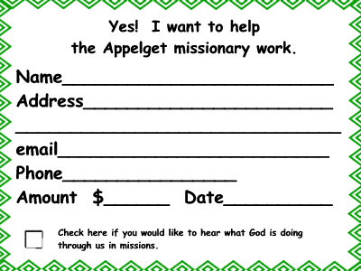 If you are wondering about how you can give to the ministry of the Appelget family, it is a very easy process. You can send a check directly to Youth With A Mission. It is important for tax reasons to write out the check to "YWAM", then write our names, Paul and Enid Appelget, on a separate sheet of paper and send it with the check. Or you can simply print out and use the form below. These contributions are tax deductible. Mail the check to the following address: