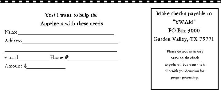 Also we have included some of our own personal needs. So once again we are at a challenge point. But are looking to God. Please be ready for our phone call or e-mail. Please help us. .