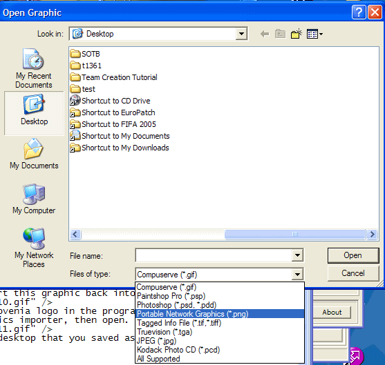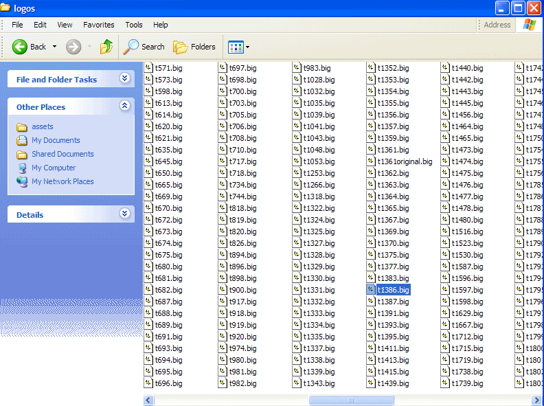 Well the first thing to do is to find out where this graphic is kept. The menu graphic is kept in the Fifa 2005\data\gui\assets\logos directory. So find the Fifa 2005 folder. Click Data folder. Click gui folder. Click assets folder. Then finally click logos folder. You will see the menu graphics for many teams. The ones with t in front are the ones that you want to be concerned about. txxxx.big. xxxx is the teamid. Well, In my case I won't be able to find t1340.big, because it doesn't exist. I'm adding this team to the game, not overwriting an old one. But, I can use whatever one from any team. I'm going to choose Slovenia, 1361, because the graphic is shaped like a flag.